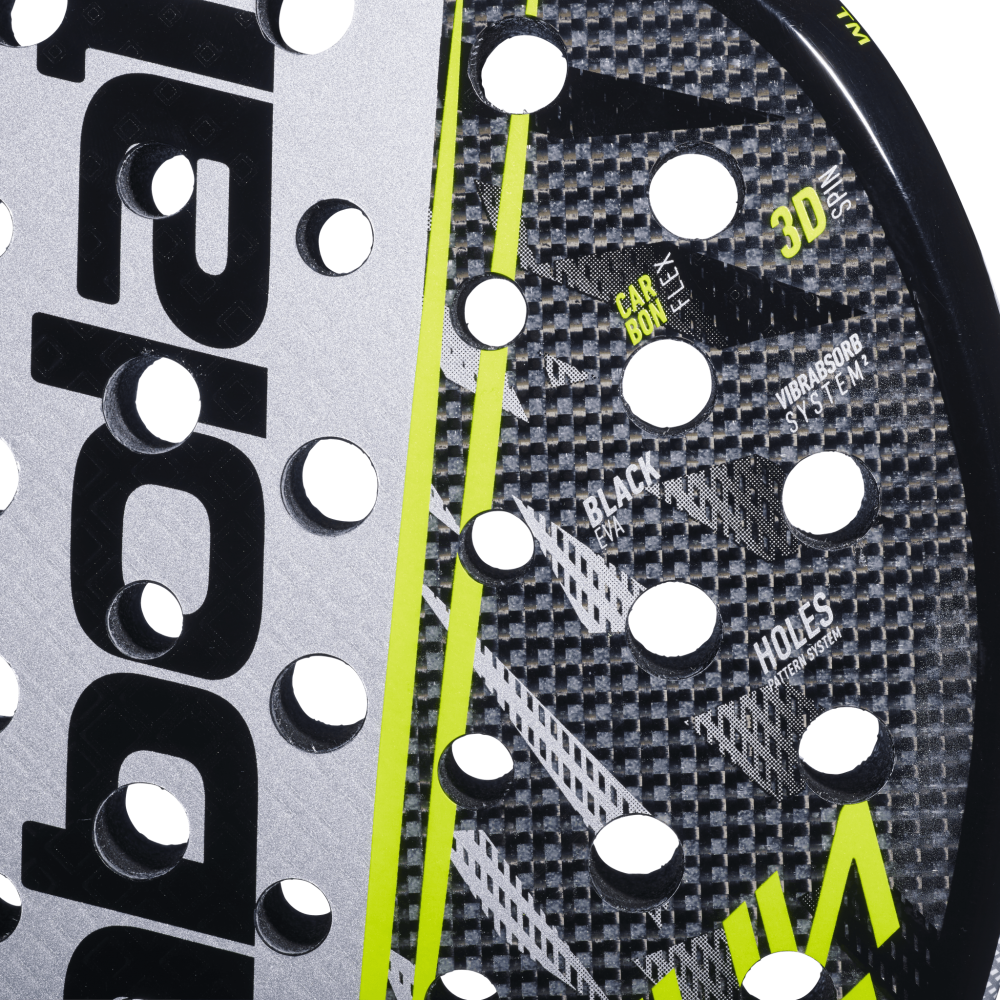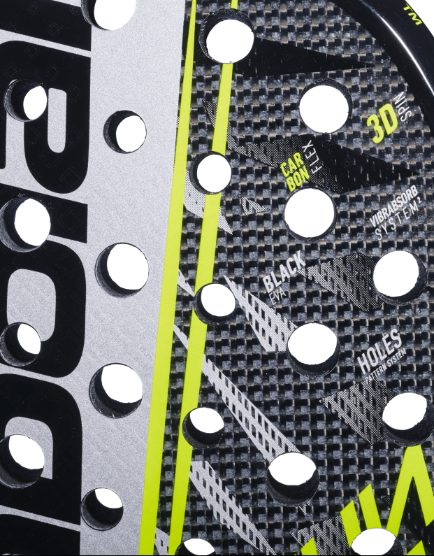 Su núcleo Eva Black proporciona salida de bola constante y cómoda, mientras que las caras en fibra de carbono y vidrio aportan durabilidad, elasticidad y suavidad en el golpeo. El acabado 3D Spin permite imprimir efectos avanzados para mejorar el control táctico de cada punto.