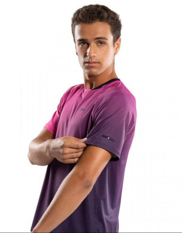 Su degradado en tonos morado y rosa aporta una estética moderna y sofisticada que destaca tanto en la pista como en el uso deportivo diario. Está confeccionada con tejido técnico ligero y transpirable, pensado para ofrecer una sensación de frescura constante incluso en los partidos más intensos.