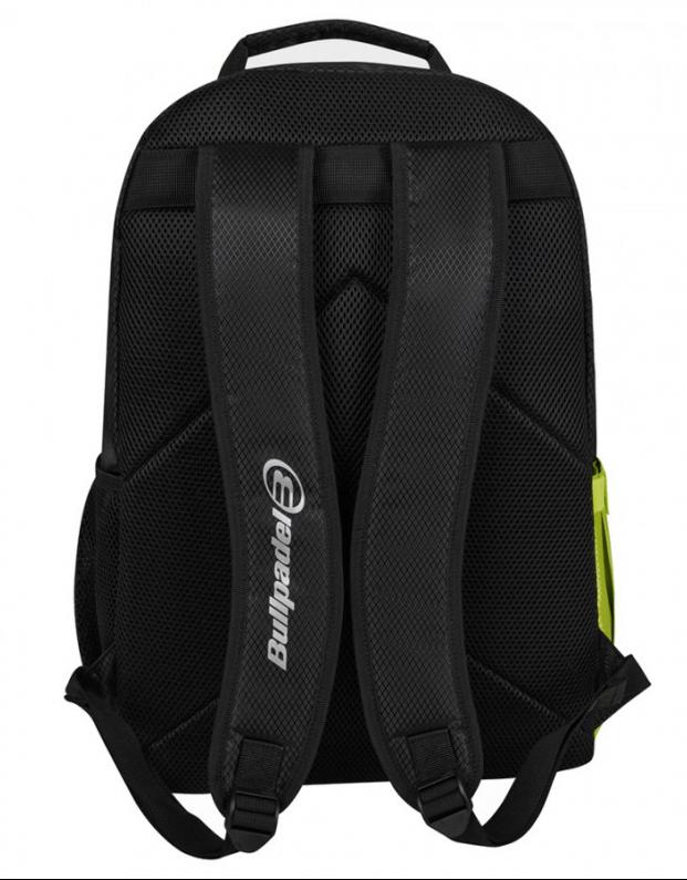 Mochila Bullpadel BPM26004 Advance 2026 negra y verde, ergonómica y resistente, con compartimentos para pala, ropa y accesorios. Ideal para entrenamiento y competición.