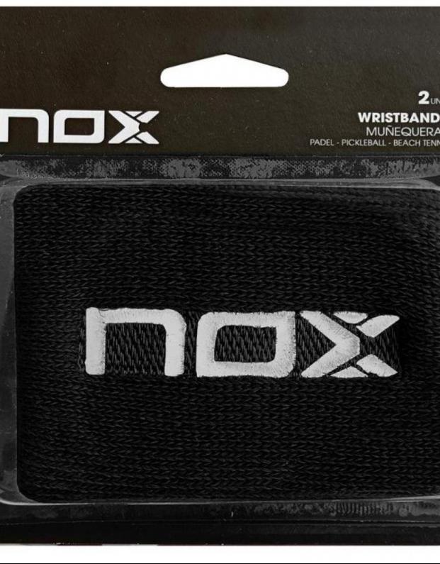 Muñequera NOX negra con logo blanco bordado. Cómoda, absorbente y resistente, perfecta para mantener el sudor bajo control en tus partidos de pádel.